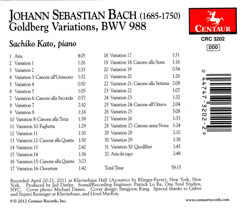 BACH Goldberg Variations • Sachiko Kato (pn) • CENTAUR CRC3202 (59:15) When this arrived in the mail, my first reaction was, “Oh...