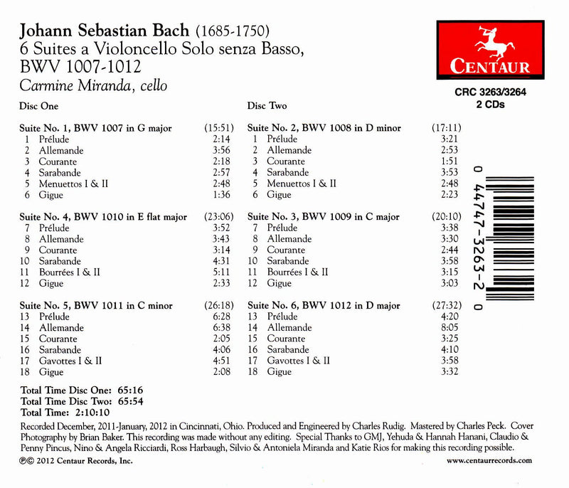 BACH Six Cello Suites • Carmine Miranda (vc) • CENTAUR 3263/4 (2 CDs: 130:10)