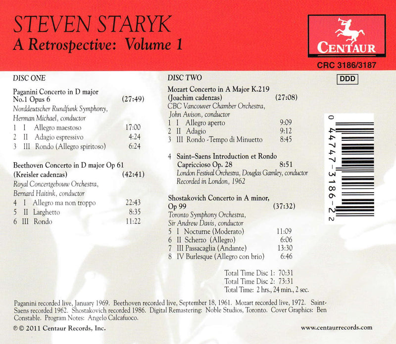 Centaur RecordsSteven Staryk: A Retrospective, Vol. 1 - Violin Concertos