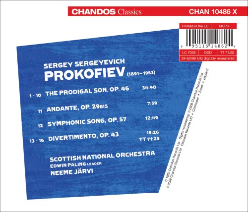 The Prodigal Son was Prokofiev's last project for the impresario Sergey Diaghilev, who died the year after the ballet was first staged, and in it the composer made his first venture into a musical world dominated not by rhythm but by melody. Järvi and the Scottish National Orchestra here perform the fascinating score complete, adding the Divertimento, the Andante which Prokofiev orchestrated from the central slow movement of his Piano Sonata No.4, Op.29, and the relatively unknown Symphonic Song. Of the original release The Canberra Times wrote, 'The playing throughout is first class, Järvi has a fine feeling for the special qualities of the music, and the engineering is excellent. This is a most attractive disc of the lesser-known music of Prokofiev, which also offers much listening pleasure'. American Record Guide commented, 'Once again, Chandos provides their usual reverberant and vibrant sound. In all its facets, this innovative and distinguished release continues their Prokofiev winning streak'.