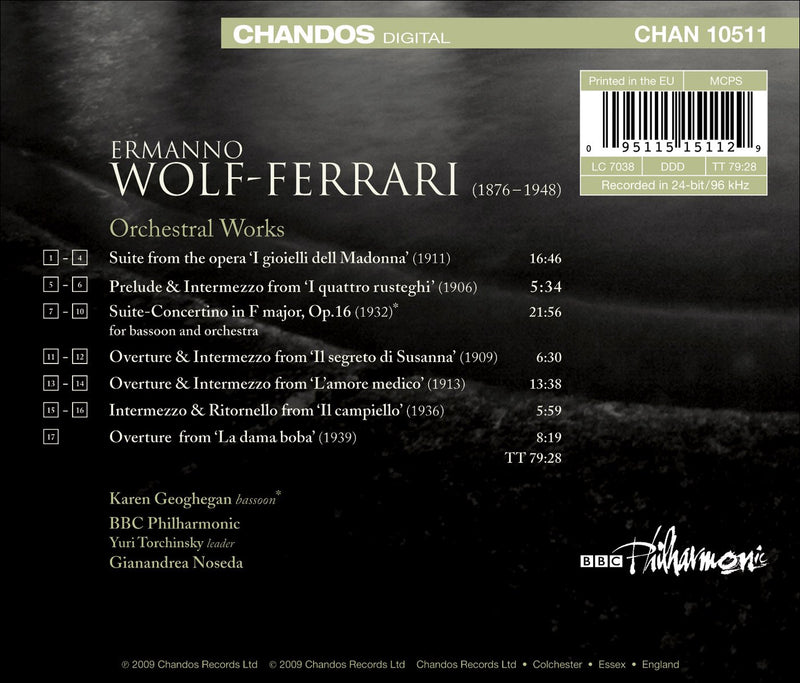 Gianandrea Noseda continues his Italian series with a recording of works of Wolf-Ferrari. This will be promoted as the March Featured Release. This is a project very close to the heart of the BBC Philharmonic's Principal Conductor, something reflected in the passionate performances he creates. BBC Music magazine commented early on that 'Noseda's affection for the music is evident throughout'. Even at the time of his appointment, he spoke of his ambition to record the works of the twentieth-century Italian composers, and he has since recorded works by Respighi and Dallapiccola. 'Gianandrea Noseda understands the music's lyrical strength and fragile sound-world perfectly; the playing of the BBC Philharmonic is exemplary, too', wrote The Guardian on the Dallapiccola disc. Known mainly for his operatic compositions, perhaps especially the overture to Il segreto di Susanna, Wolf-Ferrari was that rare phenomenon, famously exemplified by Busoni, of an Italian composer better known in Germany than in his homeland. The son of a German painter and his Italian wife, Wolf-Ferrari made his home in Munich and was throughout his life divided by the two cultures, something that provided a foundation of his creative existence, particularly in his attachment to the neo-classical style. Noseda and the BBC Philharmonic present extracts from five operas, I quattro rusteghi, Il segreto di Susanna, I gioielli della Madonna, Il campiello and La dama boba. They are complemented by the Suite-Concertino for bassoon, two horns and strings. The soloist is Karen Geoghegan who recently made her debut on Chandos following her appearance on the television programme Classical Star. With such distinguished and sympathetic advocacy, the music of Wolf-Ferrari should achieve the worldwide recognition that it deserves.
