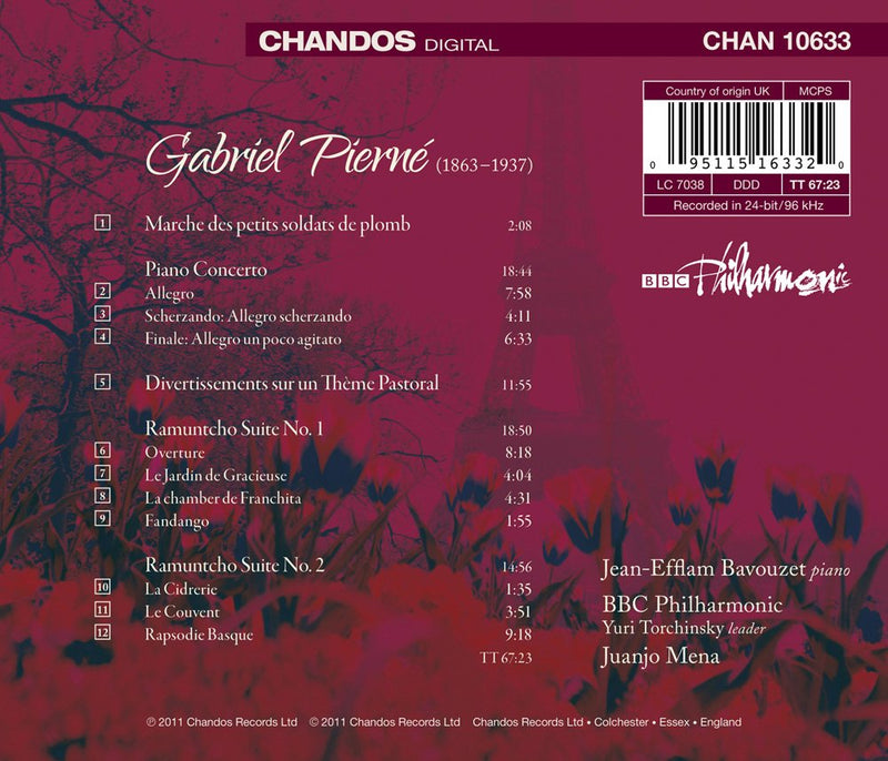 The Piano Concerto is a diverting romp in the spirit of Saint-Saëns' Second (it has no slow movement at all). The Divertissement is charm incarnate. The Ramuntcho suites incorporate Basque themes and stand in a long and illustrious line of French tributes to Spain. They are wholly wonderful. The March of the Little Lead Soldiers needs no introduction, and is not to be confused with Pierné's other "greatest hit", the March of the Super Cute Little Mythological Faun Critters from the ballet Cydalise et le chèvre-pied.