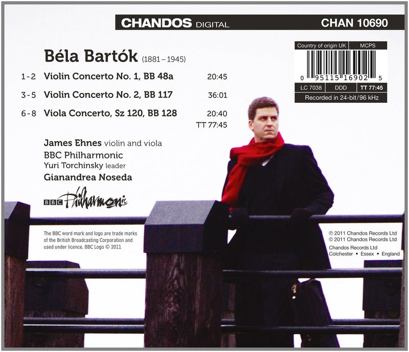 What pushes this release over the top is the brilliant fiddling of James Ehnes, combined with the incredibly intelligent idea of putting all of Bartók's string concertos together on a single disc. Ehnes, for his part, is just as comfortable on the viola as he is on the violin. He digs into the rustic Hungarian melodies in the finale of the Viola Concerto or the beginning of the Violin Concerto No. 2 with a richly resonant gusto that never turns crude, while at the same time his impeccable intonation gives the slithery chromatics of the First concerto real shape and direction. He's a phenomenal artist, make no mistake. Gianandrea Noseda's accompaniments are very good--bracing and very well paced. As so often from these forces, however, the orchestra is a touch bland--never less than proficient, most of the time a good bit more than that, but also not as arresting and colorful as it could be. Still, as I said, the quality of Ehnes' playing and the value of the program earn this disc a top recommendation. Anything less would be churlish.
