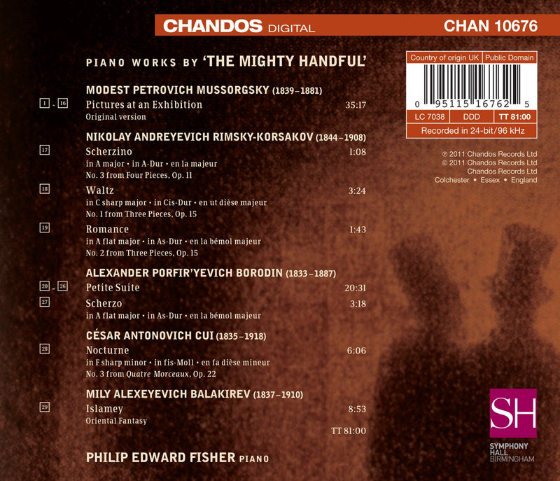 On his first solo recital disc for Chandos, Philip Edward Fisher performs piano works by members of the so-called ‘Mighty Handful’, a group of five Russian composers – César Cui, Alexander Borodin, Mily Balakirev, Modest Mussorgsky, and Nikolay Rimsky-Korsakov – who in the 1860s banded together in an attempt to create a truly national school of Russian music, free of the perceived stifling influences of Italian opera, German lieder, and other western European forms.