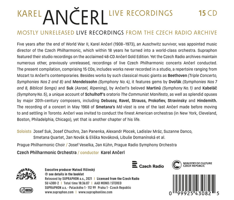From 2002 to 2008, Supraphon issued the highly acclaimed Ančerl Gold Edition with the bulk of his artistic legacy, containing nearly his complete studio recordings with the Czech Philharmonic on 48 albums. But that was far from everything. Hidden in the archive of Czech Radio, there is a wealth of concert recordings that gives us a more complete picture of this conductor. From that treasury, on 15 albums, Supraphon has selected repertoire of which studio recordings were not made; that repertoire covers a broad range from Mozart to works by Ančerl’s contemporaries.