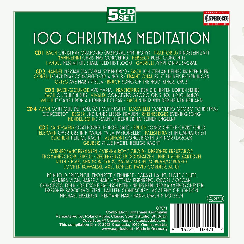 Following the success of 100 Christmas Classics (Capriccio C7331) comes Christmas Meditation, featuring 100 choral and vocal works from across the centuries....