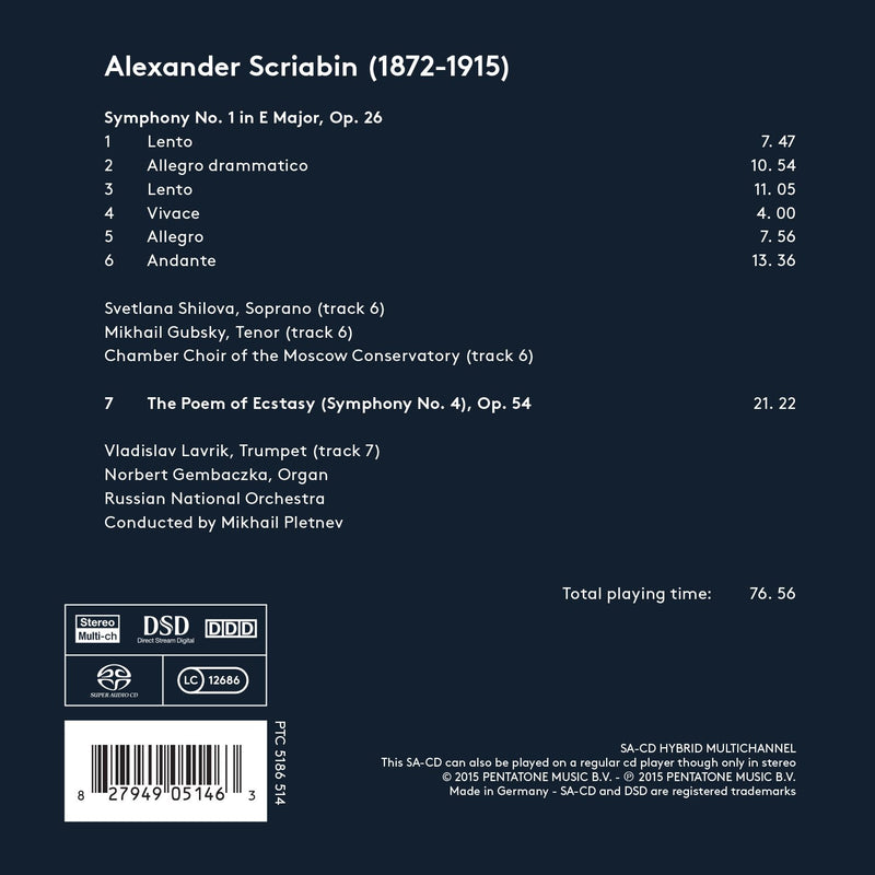 Scriabin: Symphony No. 1; The Poem of Ecstasy / Pletnev on Pentatone:    Scriabin’s First Symphony, in six movements with a vocal finale in praise of the supremacy of Art, is a remarkably sensual piece that really does demand dedicated interpreters. There’s no doubt that Muti – not always the most subtle of conductors – is one of them; he’s blessed with the legendary Philadelphia sound – Ormandy stepped down in 1980, just a few years before these recordings were made – not to mention a full-bodied recording. Listening to Segerstam after that is instructive, for while there is much detail to be found in his Scriabin performances there’s not much of the hypnotic, sense-stroking beauty that I associate with these pieces. As a result, I must exclude his set from my list of comparisons.