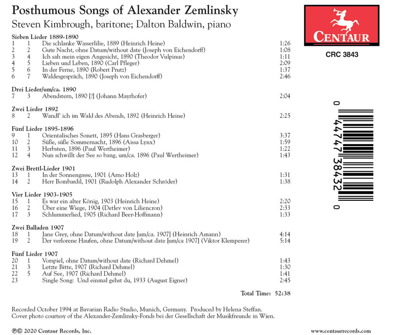 Centaur RecordsPosthumous Songs of Alexander Zemlinsky / Kimbrough, BaldwinThis selection of Posthumous Songs covers the period 1889-1909, with one song from 1933. Here one senses Zemlinsky's earliest development and years...