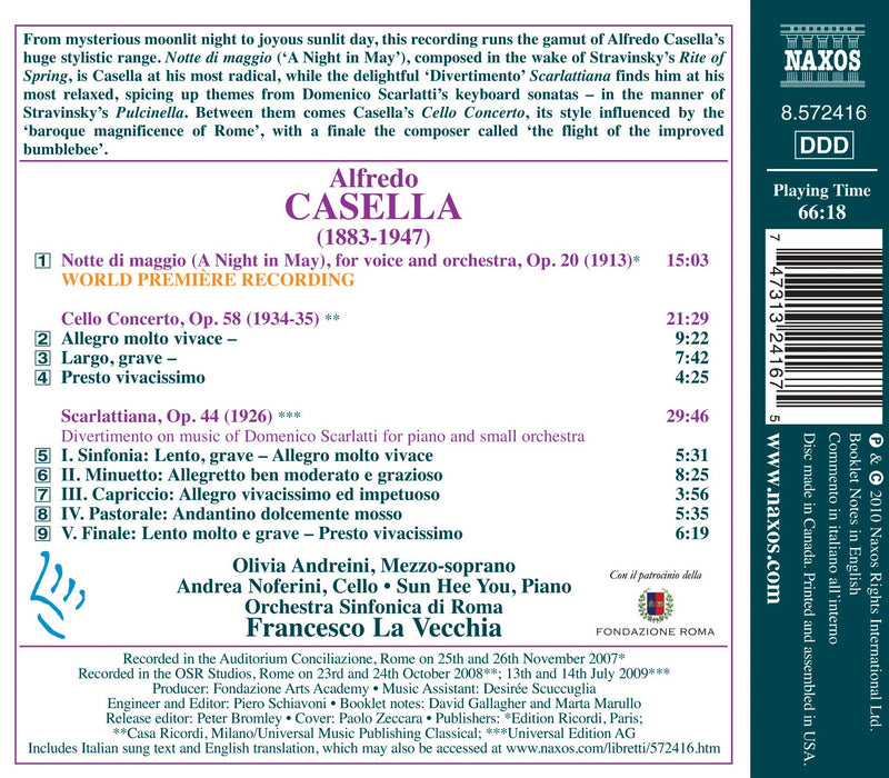 NaxosCasella: Notte Di Maggio, Cello Concerto, Scarlattiana / La Vecchia, Rome Symphony OrchestraFrom mysterious moonlit night to joyous sunlit day, this recording runs the gamut of Alfredo Casella’s huge stylistic range. Notte di maggio...
