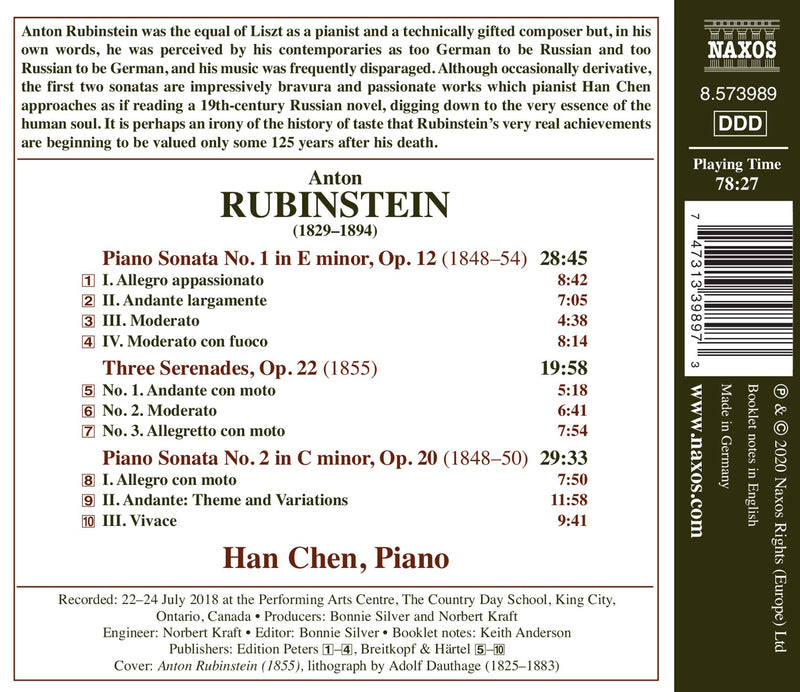On SaleNaxosRubinstein: Piano Sonatas Nos. 1 & 2 - 3 SerenadesAnton Rubinstein was the equal of Liszt as a pianist and a technically gifted composer but, in his own words, he was...