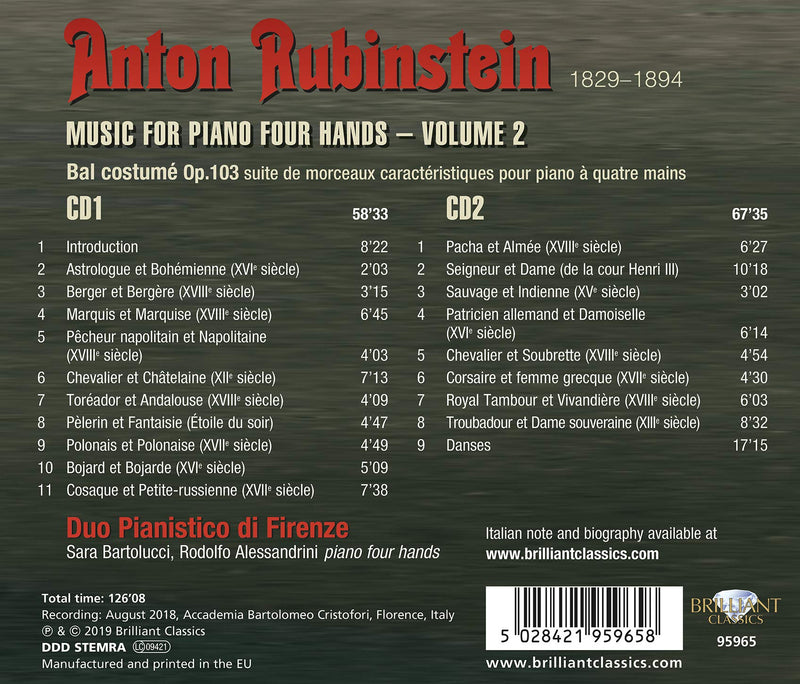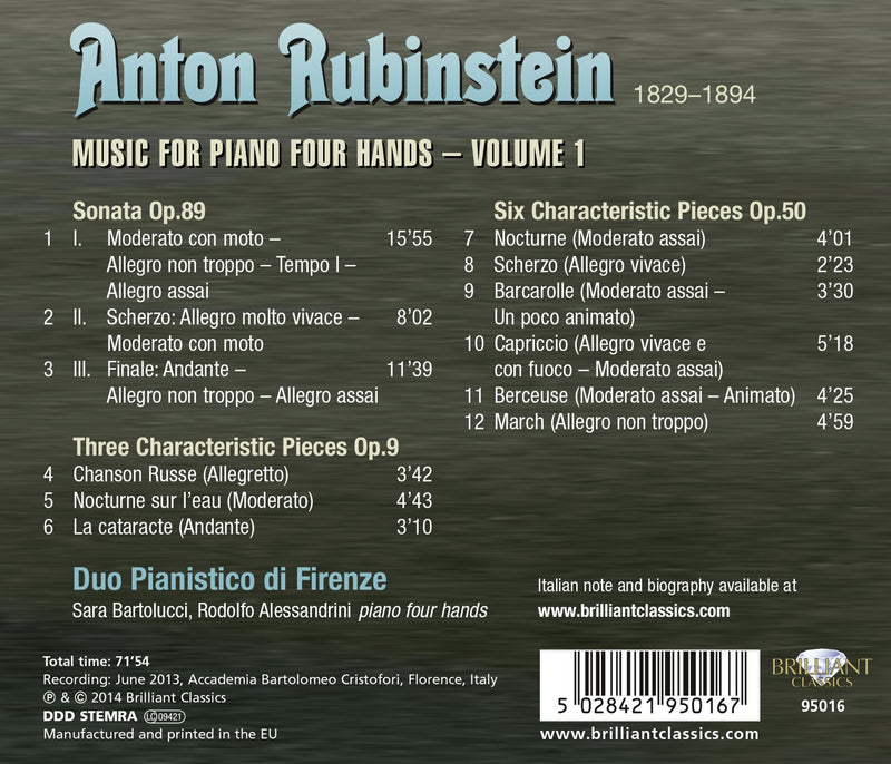 Brilliant ClassicsRubinstein: Music for Piano Four Hands, Vol. 2 / Duo Pianistico di FirenzeConductor, virtuoso pianist, founder of the St Petersburg Conservatory and composer of solo works, symphonies and operas, Anton Rubinstein (1829–1894) is a...