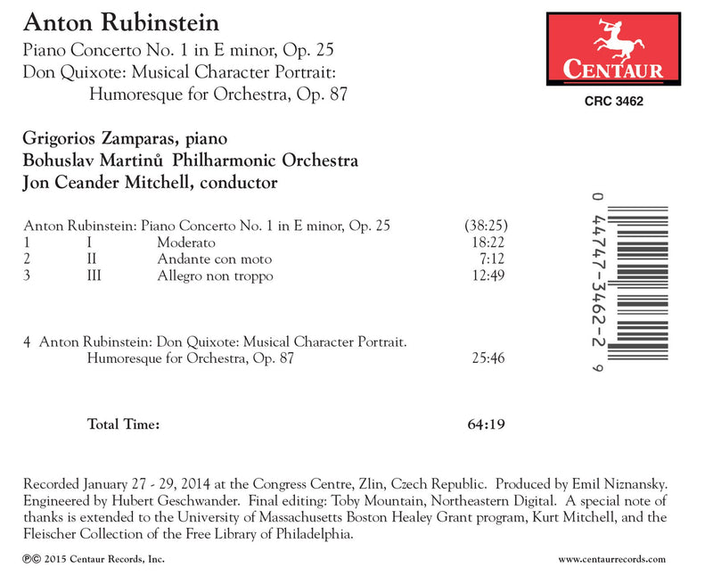 Centaur RecordsRubinstein: Piano Concerto No. 1 & Don Quixote / Zamparas, MitchellA new addition to Centaur's Complete Recordings of Anton Rubinstein Piano Concertos, this release features Grigorios Zamparas, Jon Caender Mitchell and the...