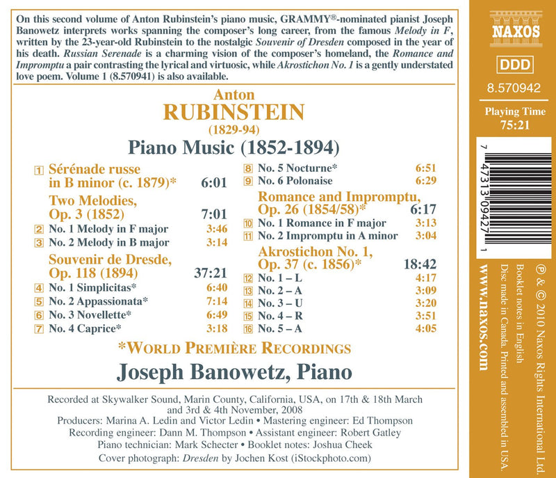 On SaleNaxosAnton Rubinstein: Piano Music, Vol. 2 / Joseph BanowetzA. RUBINSTEIN Sérénade russe. 2 Melodies, op. 2. Souvenir de Dresde, op. 118. Romance and Impromptu, op. 26. Akrostikon No. 1, op....
