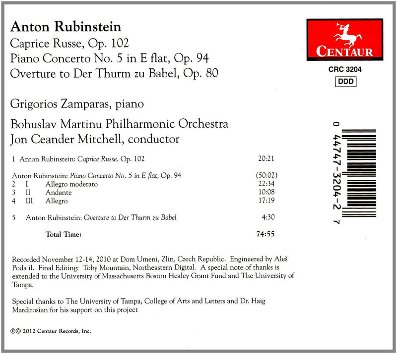 Centaur RecordsRubinstein: Caprice Russe; Piano Concerto No 5; Der Thurm Zu Babel Overture / Mitchell, ZamparasRUBINSTEIN Piano Concerto No. 5, Op. 94. Caprice russe, Op. 102. Der Thurm zu Babel, Op. 80: Overture • Grigorios Zamparas (pn);...