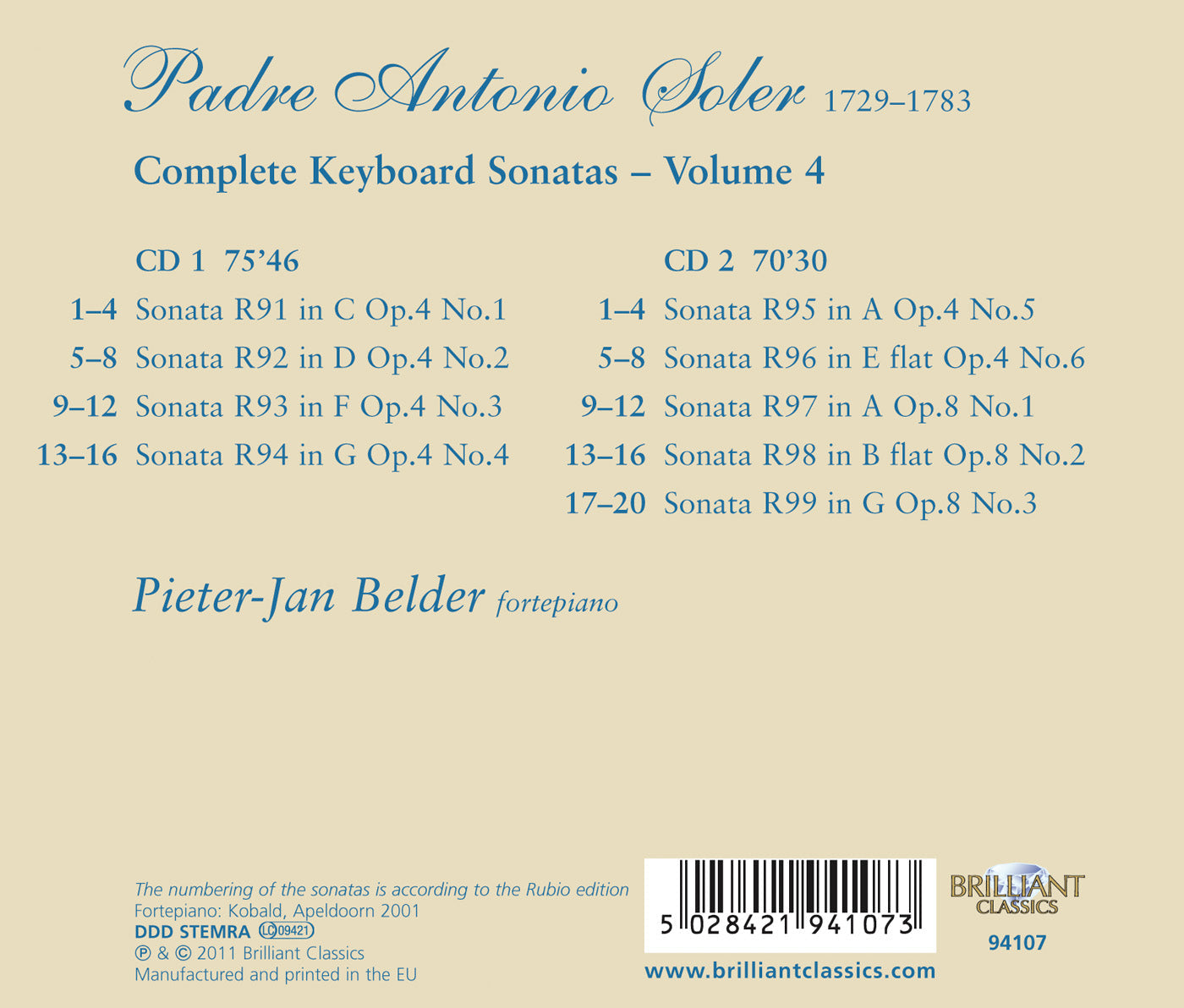 Brilliant ClassicsSoler: Harpsichord Sonatas, Col. 3 / BelderPieter-Jan Belder's zeal for the rediscovery of 17th-century keyboard music continues apace with this, the third volume in the first-ever projected complete...