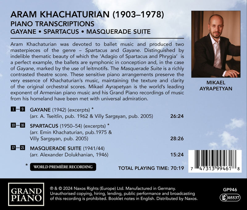 On SaleGrand PianoKhachaturian: Piano Transcriptions / AyrapetyanThese idiomatic piano transcriptions of Khachaturian's ballet scores and incidental music are performed by Armenian music specialist Mikael Ayrapetyan. Includes the famous...
