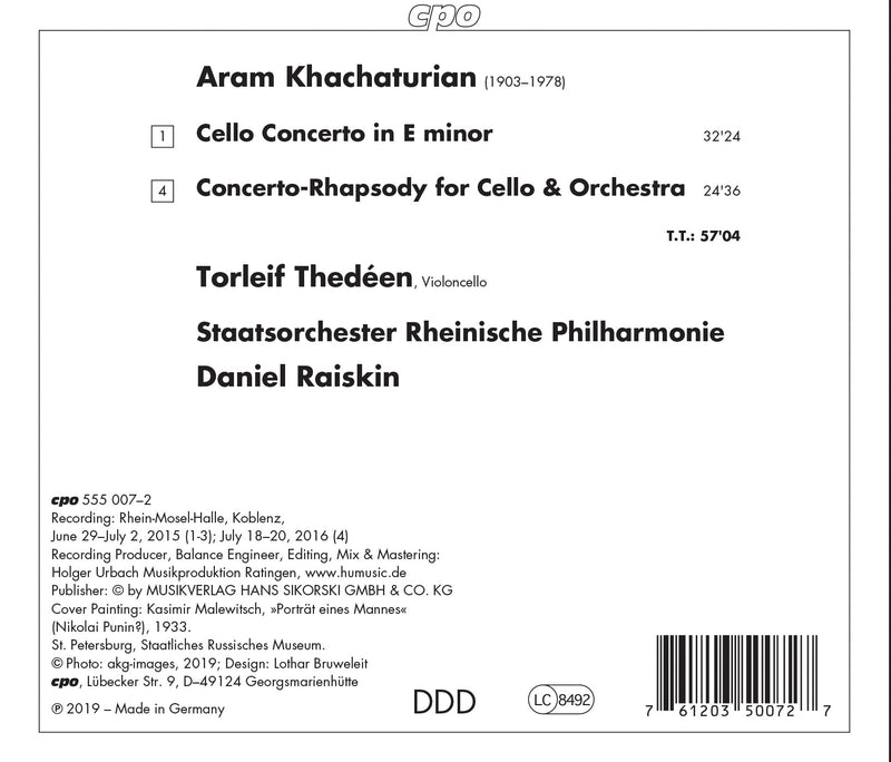 CPOKhachaturian: Cello Concerto; Rhapsody etc. / Thedeen, Raiskin, Staatsorchester Rheinische PhilharmonieAram Khachaturian was an established Soviet artist when he realized an old dream of his in the first postwar year 1946 and...