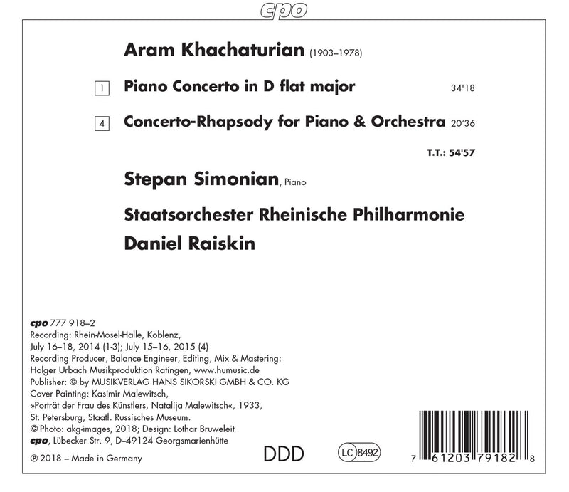 CPOKhachaturian: Violin Concerto & Concerto Rhapsody / Weithaas, Raiski, Rhine Philharmonic State OrchestraIn the 1960s Aram Khachaturian engaged in a number of experiments in which he covered terrain situated at an astonishing distance from...