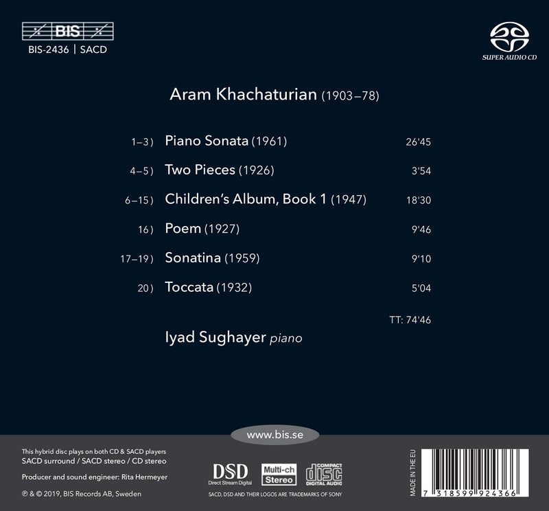 This disc is unreservedly recommended to lovers of magnificent pianism and outstanding recorded fidelity. The style, technique and taste of the performer and the sonics in both formats (unquestionably helped along by the remarkable acoustics of the Stoller Hall) will amply reward the curious, more than the attractions of Aram Khatchaturian’s defiantly uneven piano music. Having said that, while I have no doubt whatsoever that Iyad Sughayer will in time make far more important recordings than this, I applaud his imagination and sense of adventure in kicking off his career with Khachaturian as opposed to more tried and tested repertoire. BIS appear to have unearthed another piano-playing diamond.