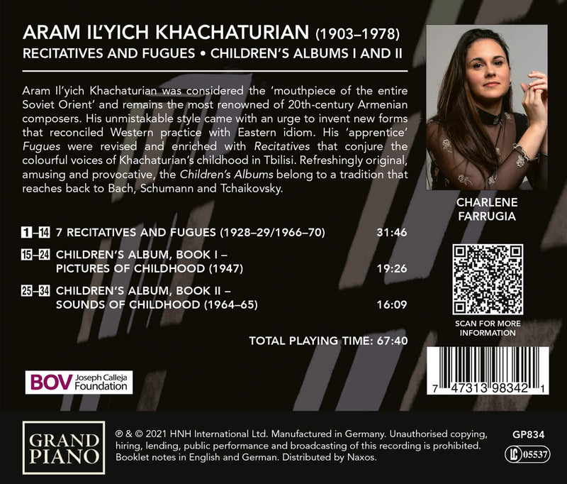 Aram Il’yich Khachaturian was considered the ‘mouthpiece of the entire Soviet Orient’ and remains the most renowned of 20th-century Armenian composers. His unmistakable style came with an urge to invent new forms that reconciled Western practice with Eastern idiom. His ‘apprentice’ Fugues were revised and enriched with Recitatives that conjure the colorful voices of Khachaturian’s childhood in Tbilisi. Refreshingly original, amusing and provocative, the Children’s Albums belong to a tradition that reaches back to Bach, Schumann and Tchaikovsky. The Maltese pianist Charlene Farrugia studied with Dolores Amodio, and with Diana Ketler at the Royal Academy of Music in London. For several years she was mentored by Boris Petrushansky. She gained her doctorate in performance under Kenneth Hamilton with a thesis on piano repertory for the left hand. In 2018 she received Malta’s International Achievement Award, and was made an Associate of the Royal Academy of Music in 2020. An ambassador of EMMA (Euro Mediterranean Music Academy) for Peace, under the auspices of UNESCO, she is currently on the teaching faculty at the Music Academy, Juraj Dobrila University of Pula, Croatia.