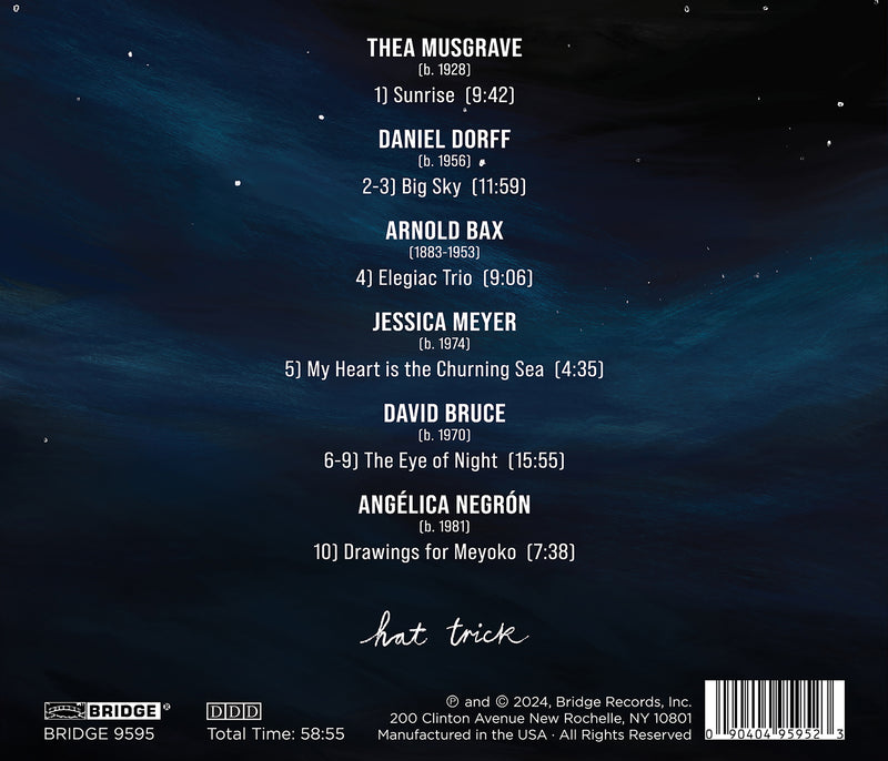 Bridge RecordsBig Sky / Hat TrickThe superb flute, harp, viola trio, Hat Trick, returns to Bridge with a fascinating program of recent works coupled with a classic....