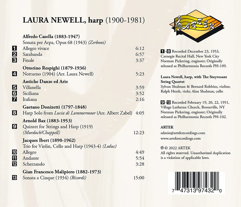 ArtekBax, Casella, Ibert, Respighi et al.: The Philharmonia Recordings / Newell, Stuyvesant QuartetThis album presents selected works performed by harpist Laura Newell. "American harpist Laura Newell was born December 16, 1900 in Denver. She...