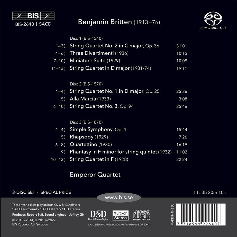 Between 2010 and 2014, the British Emperor Quartet released the three discs gathered here, with all of Benjamin Britten’s published music for...