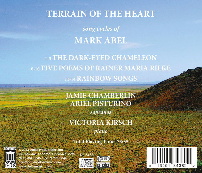 DelosAbel: Terrain of the Heart / Pisturino, Chamberlin, Kirsch"On these three unique art song cycles, composer Mark Abel combines hard‐hitting lyrics and a unique musical fusion of rock and classical....