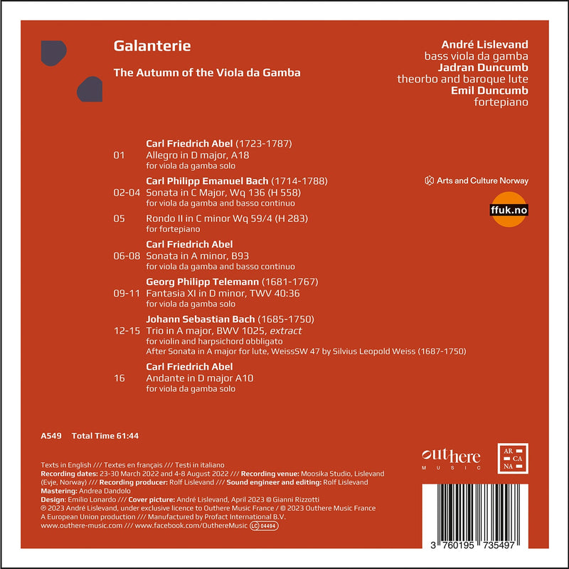 ArcanaAbel, J.S. Bach; C.P.E. Bach & Telemann: Galanterie - The Autumn of the Viola da GambaAwarded a Diapason Découverte, André Lislevand’s debut album Forqueray Unchained (Arcana A486, 2021) celebrated one of moments of greatest splendor for the...
