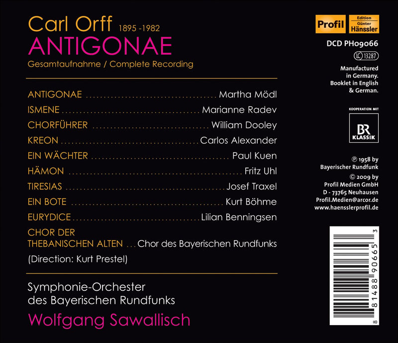 ORFF Antigonae • Wolfgang Sawallisch, cond; Martha Mödl (Antigone); Carlos Alexander (Creon); William Dooley (Chorus Leader); Fritz Uhl (Haemon); Marianne Radev (Ismene); Paul Kuen (Guard); Joseph Traxel (Tiresias); Kurt Böhme (Messenger); Lilian Benningsen (Eurydice); Bavarian RSO & Ch • PROFIL 09066 (2CDs: 143:06) Live: Munich 1958