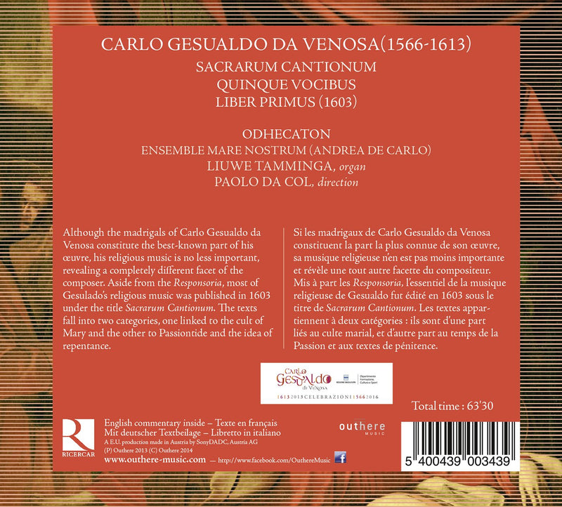 RicercarCarlo Gesualdo Da Venosa: Sacrarium Cantionum Quinque VocibusAlthough the madrigals of Carlo Gesualdo da Venosa constitute the best-known part of his oeuvre, his religious music is no less important,...