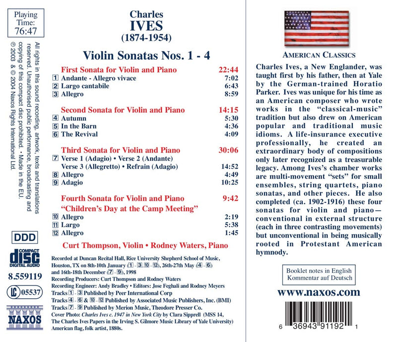 True, Thompson doesn't match the tonal and expressive variety violinist Gregory Fulkerson commands in the above-mentioned reference versions, which are better engineered as well. But you can't beat having all four Ives Sonatas on a single, bargain-priced disc, and the brilliant booklet notes by Ives scholar H. Wiley Hitchcock are models of their kind. Recommended.