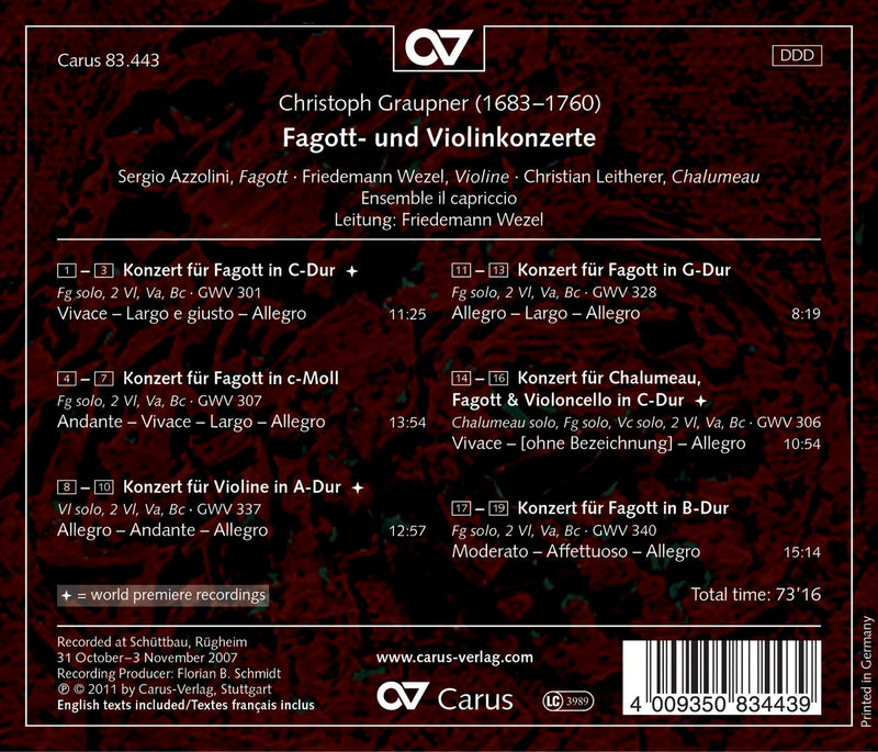 CarusGraupner: Concertos For Bassoon And Violin / Wezel, Azzolini, Leitherer, Ensemble Il CapriccioClassical Music