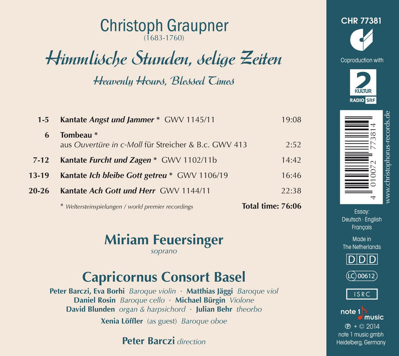 ChristophorusGraupner: Himmlische Stunden, Seelige Zeiten / Feuersinger, Capricornus Consort BaselGRAUPNER Angst und Jammer, GWV 1145/11. Furcht und Zagen, GWV 1102/11b. Ich bleibe Gott getreu, GWV 1106/19. Ach Gott und Herr, GWV...