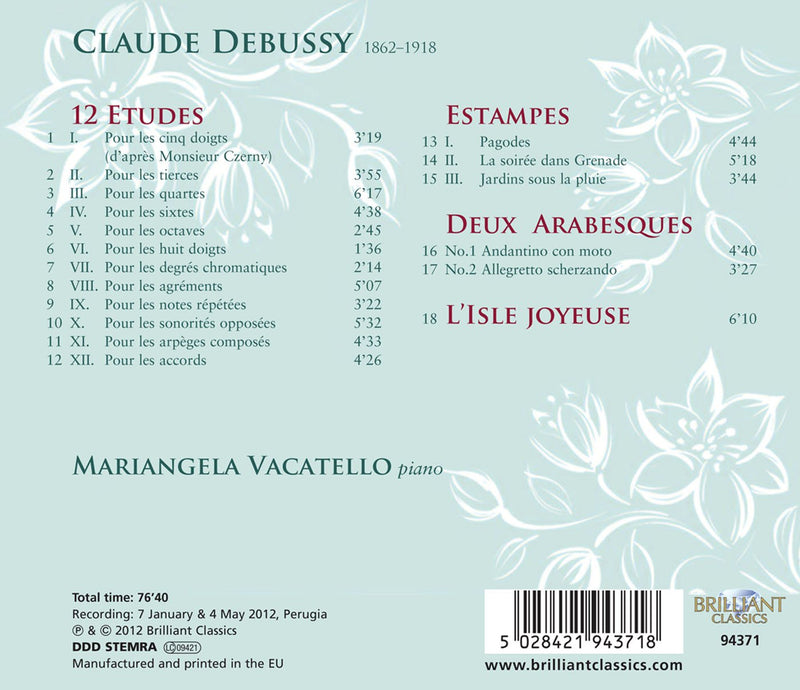 DEBUSSY 12 Etudes. Estampes. Deux Arabesques. L’Isle Joyeuse • Mariangela Vacatello (pn) • BRILLIANT 94371 (76:40) Every so often—perhaps inspired by Jorge...