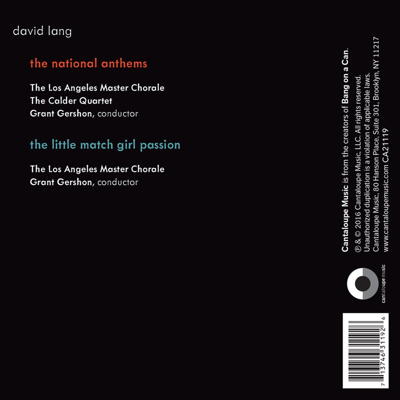 Cantaloupe MusicLang: The National Anthems / Los Angeles Master Chorale, Calder String Quartet“We group ourselves into nations,” David Lang writes in the program note, “but it has never really been clear to me what...