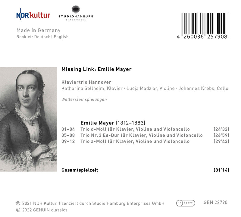 GenuinEmilie Mayer: Missing Link - World Premiere Recordings / Hanover Piano TrioThe Klaviertrio Hannover lands a real coup with its world premiere recording of three piano trios by the composer Emilie Mayer, who...