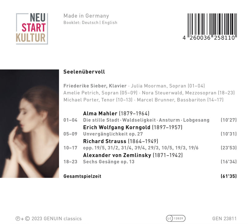 GenuinKorngold, Mahler, Strauss & Zemlinsky: Seelenubervoll (Brimming Souls) / SieberThe debut album of pianist Friederike Sieber, Seelenübervoll is featuring lieder from the late Romantic period and works by Alma Mahler, Erich...