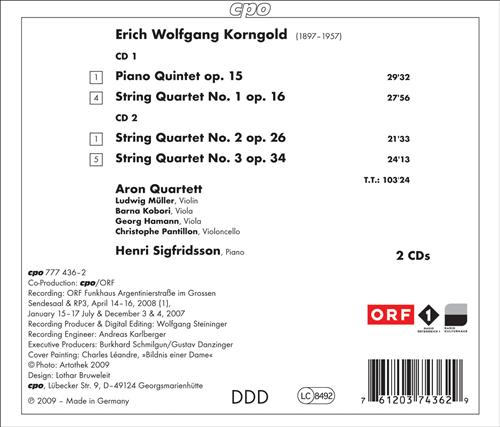 CPOKorngold: String Quartets 1-3, Piano Quintet Op 15 / Sigfridsson, Aron QuartettKORNGOLD String Quartets Nos. 1-3; Piano Quintet 1 • Aron Qrt; 1 Henri Sigfridsson • CPO 777 436-2 (2 CDs: 103:24) “I...