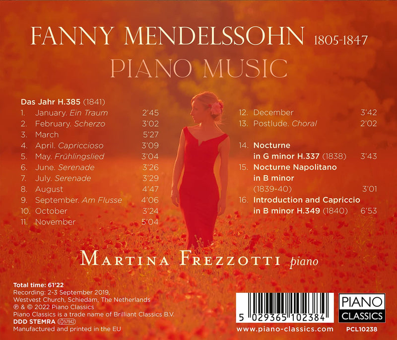 The piano cycle Das Jahr (The Year) (1841) is the main work of this collection, written during her Italian journey. It is made up of twelve pieces, each bearing the name of a month, plus an epilogue, each expressing the particular feelings and atmosphere of the month in question. There are many thematic cross references between the pieces, as well as numerous references to Bach, connected to the music typical for the Lutheran worship. Also included are the two Nocturnes and the Introduction and Capriccio in B minor, in which the influence of her brother Felix is particularly evident. Italian pianist Martina Frezzotti studied with Lazar Berman at the Piano Academy of Imola and later with Elisso Virsaladze at the prestigious Tchaikovsky Conservatory in Moscow, where she obtained her Doctorate in Music with full marks in 2012, the first Italian in history of this prestigious university.