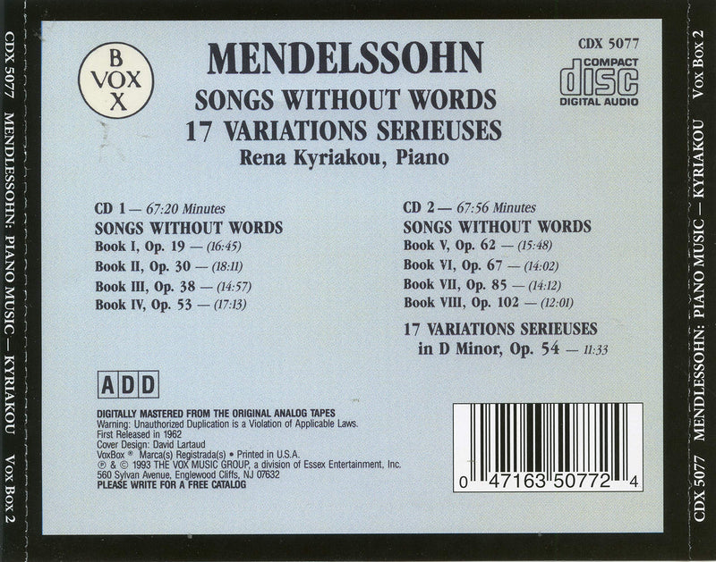 It's good to have Rena Kyriakou's lovingly cultivated Mendelssohn Songs Without Words available again through Arkivmusic.com's on-demand reprint program, despite Vox's dry...