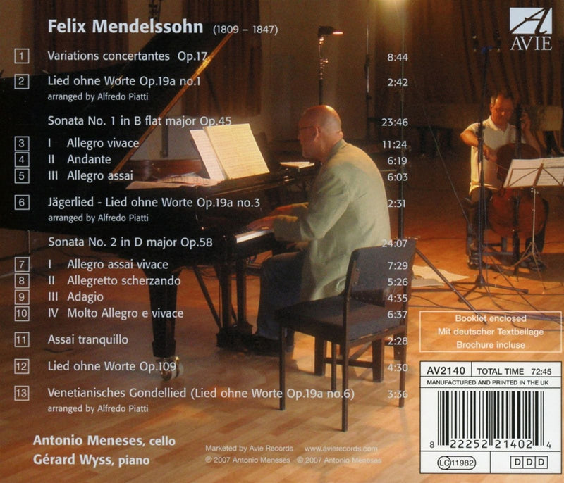 MENDELSSOHN Cello Sonatas: in B?, op. 45; in D, op. 58. Variations concertantes, op. 17. Assai tranquillo. Lieder ohne Worte, op.19a/1,3,6 (arr. Piati); op.109 • Antonio Meneses (vc); Gérard Wyss (pn) • AVIE 2140 (72:45)