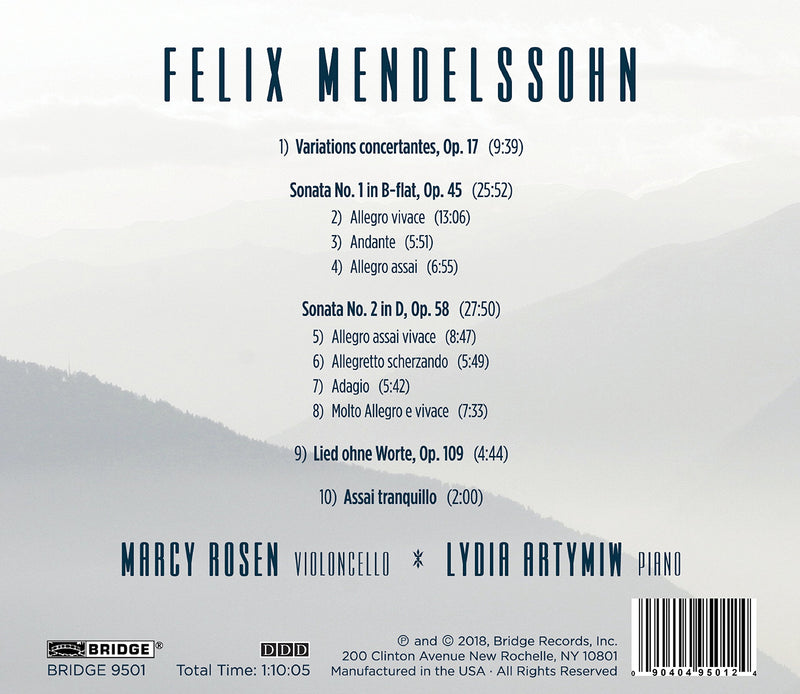 Paul Mendelssohn, Felix’s younger brother, was a banker by profession but an accomplished amateur cellist, and it is to him that we owe Felix Mendelssohn's three major compositions for cello and piano. This new recording presents Mendelssohn's complete output for cello and piano, and includes the three large scale works, as well as two short pieces, performed by leading virtuosi Marcy Rosen and Lydia Artymiw. Marcy Rosen has established herself as one of the most important and respected artists of our day. Los Angeles Times music critic Herbert Glass has called her "one of the intimate art's abiding treasures." She has performed in recital and with orchestra throughout Canada, England, France, Japan, Italy, Switzerland, and all fifty of the United States. She made her concerto debut with the Philadelphia Orchestra at the age of eighteen and has since appeared with such noted orchestras as the Dallas Symphony, the Phoenix Symphony, the Caramoor Festival Orchestra, the Orpheus Chamber Orchestra in Carnegie Hall, the Jupiter Symphony and Concordia Chamber Orchestra at Alice Tully Hall, and the Tokyo Symphony at the famed Orchard Hall in Tokyo. Lydia Artymiw has emerged as one of the most compelling and individual pianists of her generation. For over forty years, she has consistently earned rave reviews, firmly establishing herself as a unique artistic personality with rare communicative gifts. Critics have praised her artistry and highly original interpretations, her warmth, intelligence, poetic gifts, thoughtfulness, versatility, and most of all, her distinctive and beautiful sound.