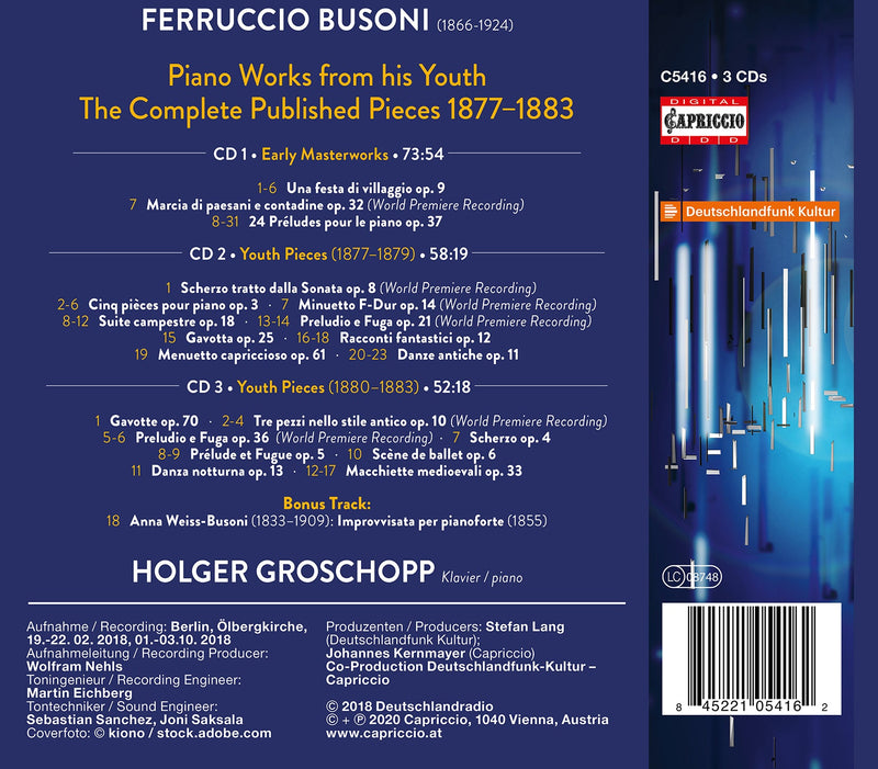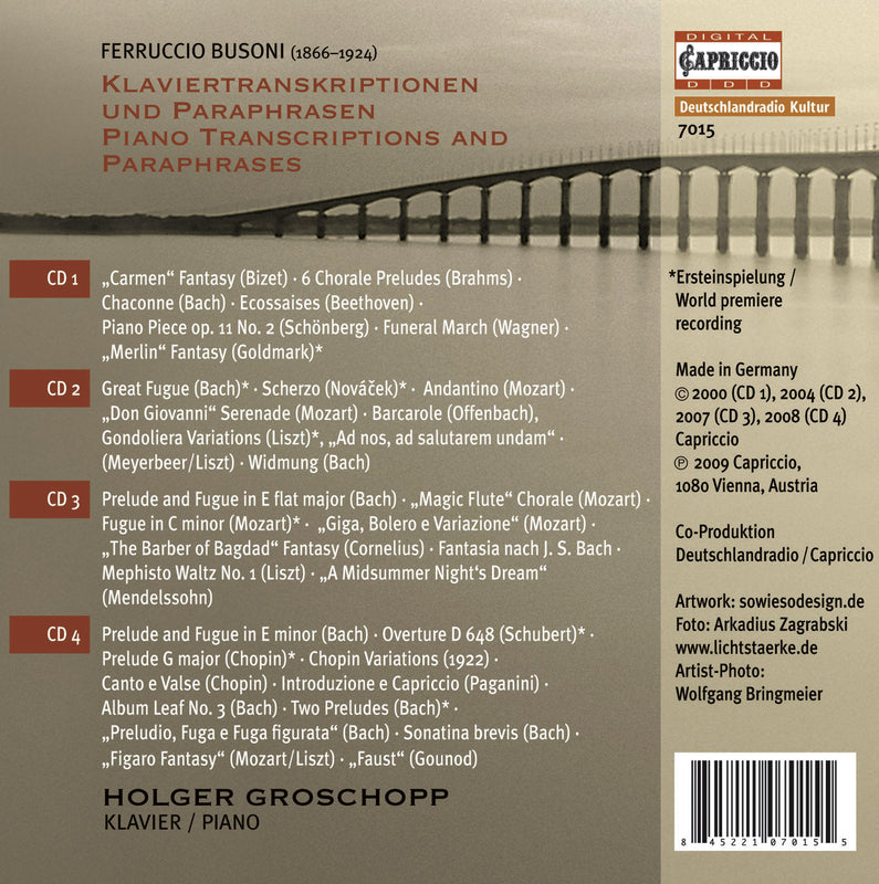 CapriccioBusoni: Piano Transcriptions / Holger GroschoppThis album is, simply, a necessary addition to the Busoni discography, carried off with panache. A studio recording, sound is uncramped, gutsily...