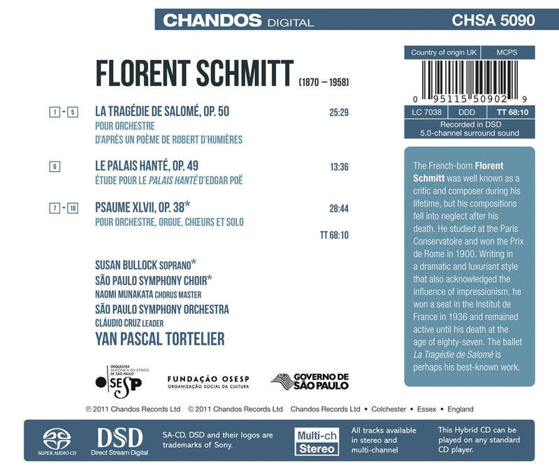 ChandosSchmitt: La Tragedie De Salome, Le Palais Hante, Psaume 47 / Tortelier, Bullock, São Paulo SymphonyThis is a hybrid Super Audio CD playable on both regular and Super Audio CD players. An auspicious and impressive debut for...