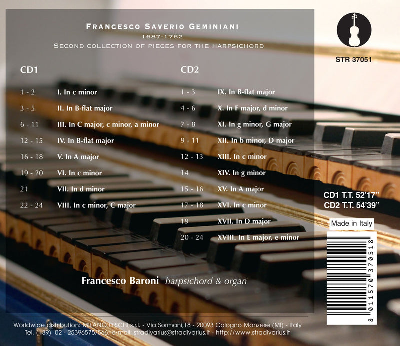 StradivariusGeminiani: Second Collection of Pieces for the Harpsichord / BaroniAmong the numerous musical works by Francesco Geminiani, renowned virtuoso, theorist and versatile composer, the transcriptions for harpsichord are practically unknown. They...