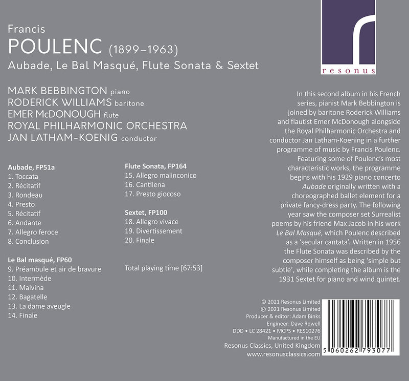 Resonus ClassicsPoulenc: Aubade - Le bal masqué - Flute Sonata - Sextet / Bebbington, McDonough, Williams, Latham-Koenig, Royal Philharmonic Orchestra