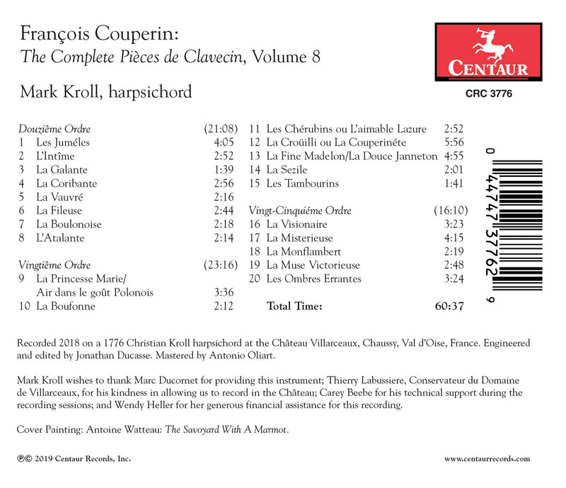 Centaur RecordsCouperin: Complete Pieces De Clavecin Vol. 8This is Volume 8 in Centaur's recording of the complete Pieces de Clavecin of Francois Couperin, performed on harpsichord by Mark Kroll....