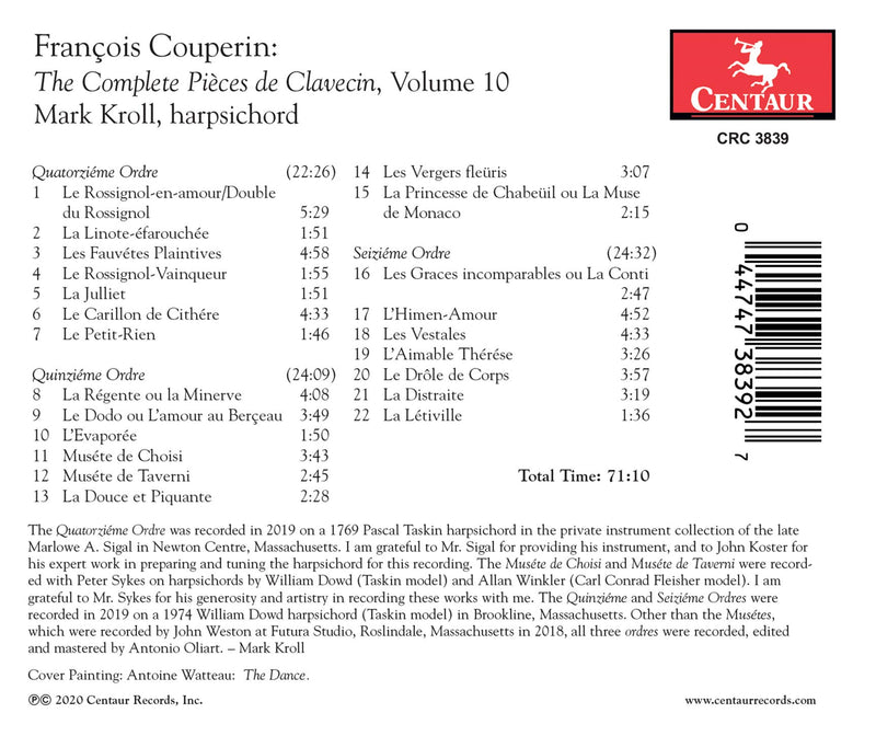 Centaur RecordsCouperin: The Complete Pièces de Clavecin, Vol. 10This is Volume 10 in Centaur's complete traversal of the keyboard works of Francois Couperin, performed by Mark Kroll. This is a...