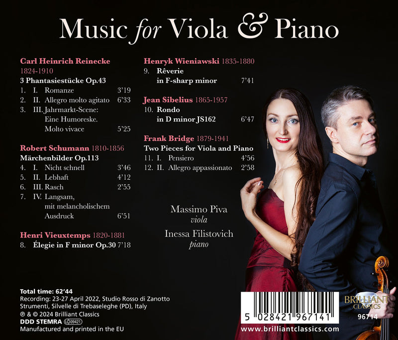 On SaleBrilliant ClassicsMusic for Viola & Piano by Schumann, Sibelius et al. / Piva, FilistovichOn this unique and originally programmed journey, the violist Massimo Piva takes the kind of fantasy journey (Fantasiereise) that forms one of...